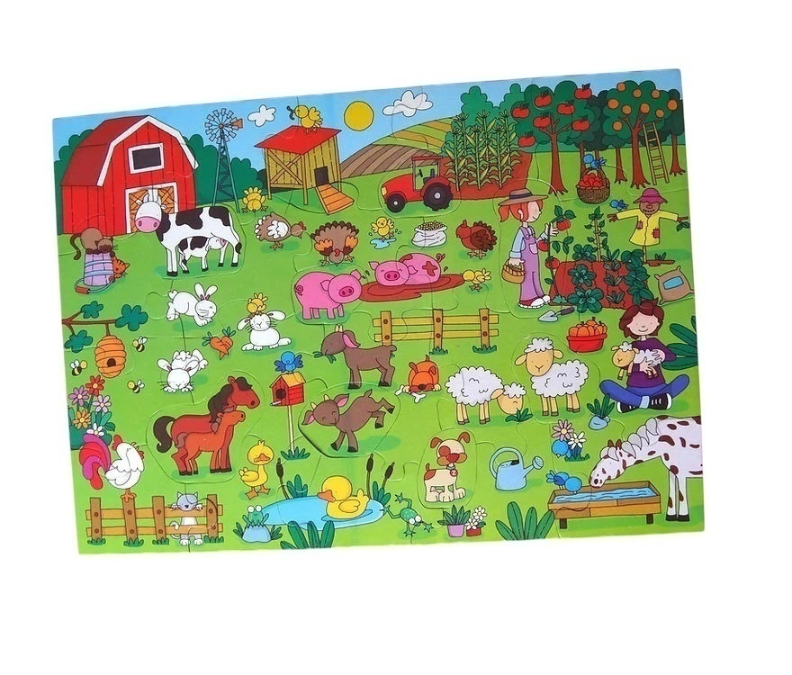 Incluye 28 piezas de cartón extra gruesas. 2 niveles de dificultad con 8 piezas enteras para encastrar: Vaca, Caballo, Tractor, Chica, Chancho, Cabrito, Oveja y Perro.