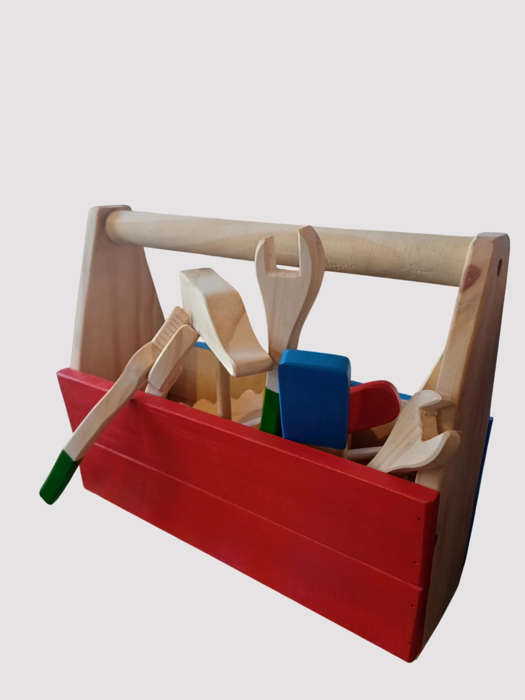 Un set didáctico ideal para que los peques se diviertan imitando a los grandes. Incluye un práctico cajón de madera con manija y diferentes herramientas (martillo, serrucho, destornillador, llave inglesa y más) diseñadas en madera resistente y pintadas a mano con colores cálidos.